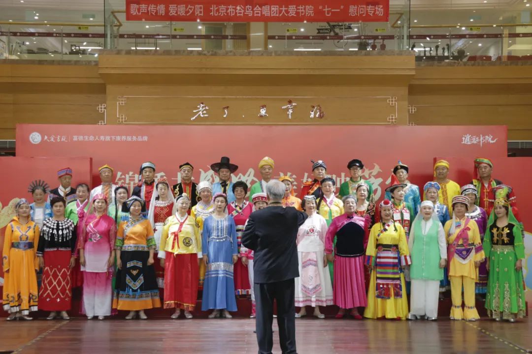 6月24日,享有盛誉的北京布谷鸟合唱团率先登台,为大爱书院带来了一场高规格的七一专场演出。该团成立于1990年5月,拥有辉煌的艺术履历:曾多次参与中央电视台“综艺大观”、“七色光”及中国国际广播电台、北京广播电视台等节目录制;参与香港、澳门回归及建党90、100周年等重大庆典演出;代表中国和亚洲参加第18届冬奥会开幕式全球同步演唱;并献演马来西亚建交30周年专场及中国国际合唱节等重要舞台。 此次演出,他们以“国家队”级的演唱水准和饱满情感,倾情演绎了《大爱书院温暖的家》、《绒花》、《望月》、《洪湖水浪打浪》、现代京剧选段《大吊车真厉害》、音乐舞蹈史诗《东方红》选曲《双双草鞋送亲人》、《红梅赞》、《红旗飘飘》等多首经典曲目。值得一提的是,在合唱团优秀的团员中,闪耀着合唱团副团长大爱书院在住长者曲折叔叔的身影。他的参与,不仅展现了个人风采,更成为连接专业艺术团体与书院养老生活的生动桥梁。